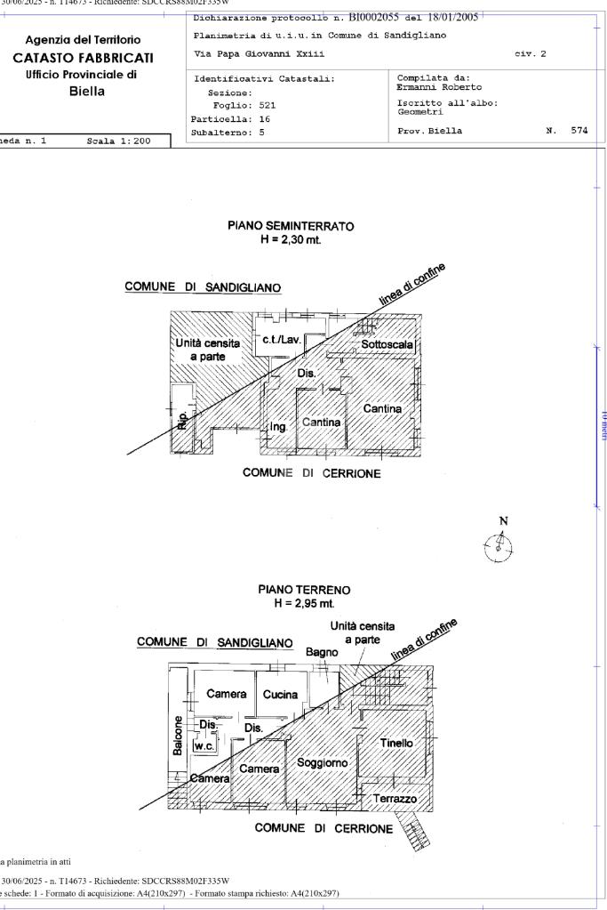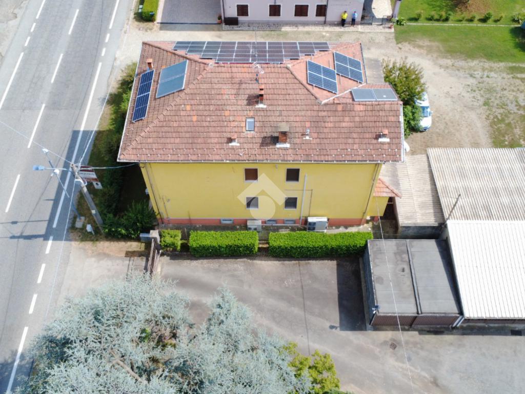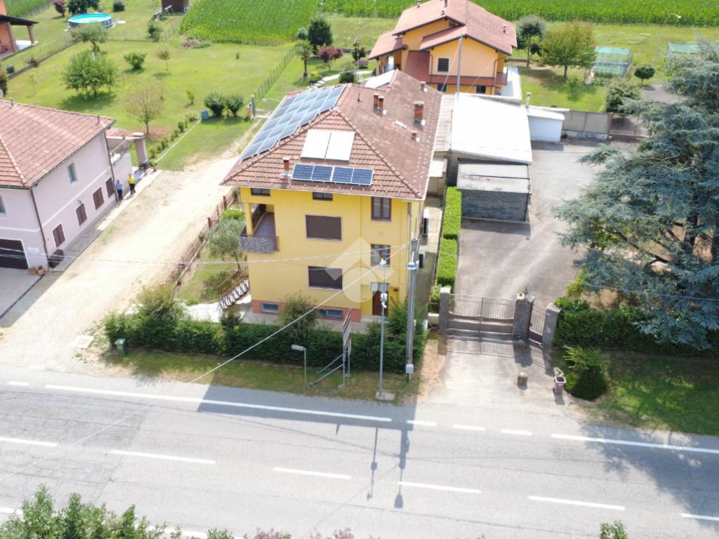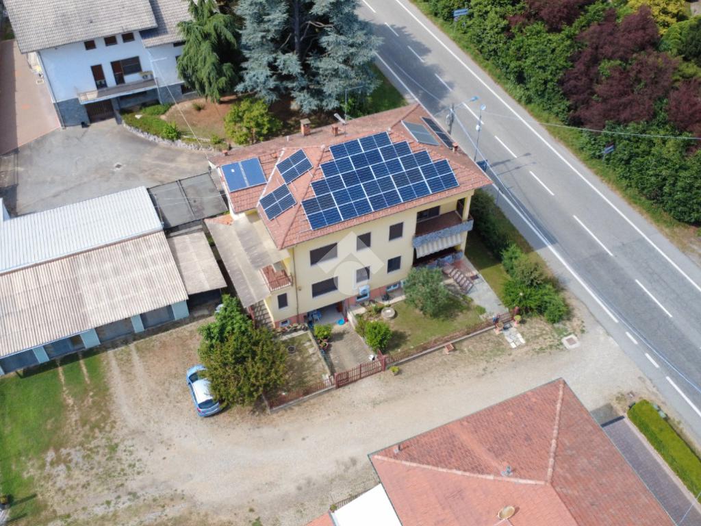Lungo la strada che conduce a Sandigliano, bifamiliare ristrutturata nel 2021 disposta su più livelli. E’ presente un portoncino interno dal quale è possibile accedere al vano scala che conduce ai due appartamenti. Il piano rialzato, è costituito dal primo appartamento ed è composto da ingresso sulla zona giorno. Quest’ultima è costituita da uno spazioso soggiorno, separato dal locale sala da pranzo. Da questi ultimi è possibile accedere al terrazzo. Inoltre è presente la cucina abitabile. Invece, la zona notte conta di due camere da letto tra cui una con cabina armadio, un bagno di servizio ed un bagno con doccia e finestra. Inoltre, nel corridoio è possibile accedere ad un balcone dal quale si raggiunge il giardino situato lateralmente alla casa. L’accesso a quest’ultimo si ha anche dal terrazzo. Invece, il piano primo accessibile mediante il vano scala conduce al secondo appartamento. I vani sono collegati da un corridoio, la zona giorno è composta da angolo cottura e soggiorno con accesso sul balcone rivolto verso il retro della casa. Invece, la zona notte è costituita da due camere da letto, delle quali è possibile accedere al terrazzo e da un bagno con doccia e finestra. Invece, il piano secondo ospita il locale sottotetto coibentato suddiviso in due ambienti. Il riscaldamento è autonomo e suddiviso sui due piani. Il piano rialzato è riscaldato mediante pompa di calore con pannelli fotovoltaici con accumulo di 20 Kwh. Inoltre, sono presenti due condizionatori con due split che fanno aria calda/fredda. Invece, il piano primo è riscaldato mediante pompa di calore con pannelli fotovoltaici con accumulo di 20 Kwh. I pannelli fotovoltaici sono 50 in totale ed inoltre sono presenti anche 4 pannelli solari termici per la produzione dell’acqua calda sanitaria con accumulo di 200 l di acqua che servono entrambi gli appartamenti. Gli infissi sono dotati di doppi vetri e sono presenti le zanzariere. A corredo della proprietà sono presenti un box auto nel locale seminterrato, due box auto esterni ed un locale deposito.